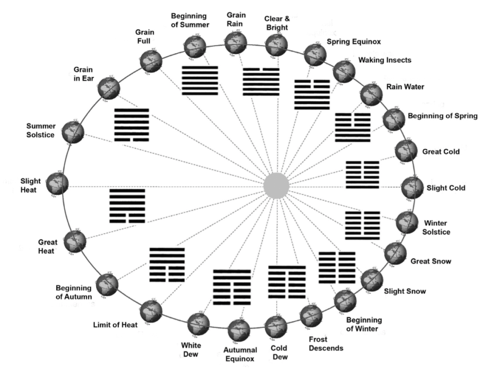 “The Chinese term for Winter Solstice (dong zhi 冬至) literally means the “extreme of yin,” and symbolically this node is represented by Hexagram 24, which is comprised of one Yang line at the bottom of 5 Yin lines. Hexagram 24’s name is Return – Fu (復). What is returning? The Yang and the light are returning. One of the basic laws of Yin-Yang theory is that of mutual transformation. When something reaches an extreme, then it naturally reverts to the opposite. Now is when Yin has reached its extreme thereby giving birth to Yang. The smaller segments, the Material Manifestations, for this node are Earthworms Congeal (Qiu Yin Jie 蚯蚓結), Moose Deer Shed Their Horns (Mi Jiao Jie 麋角解), and Aquifers Stir (Shui Quan Dong 水泉動).